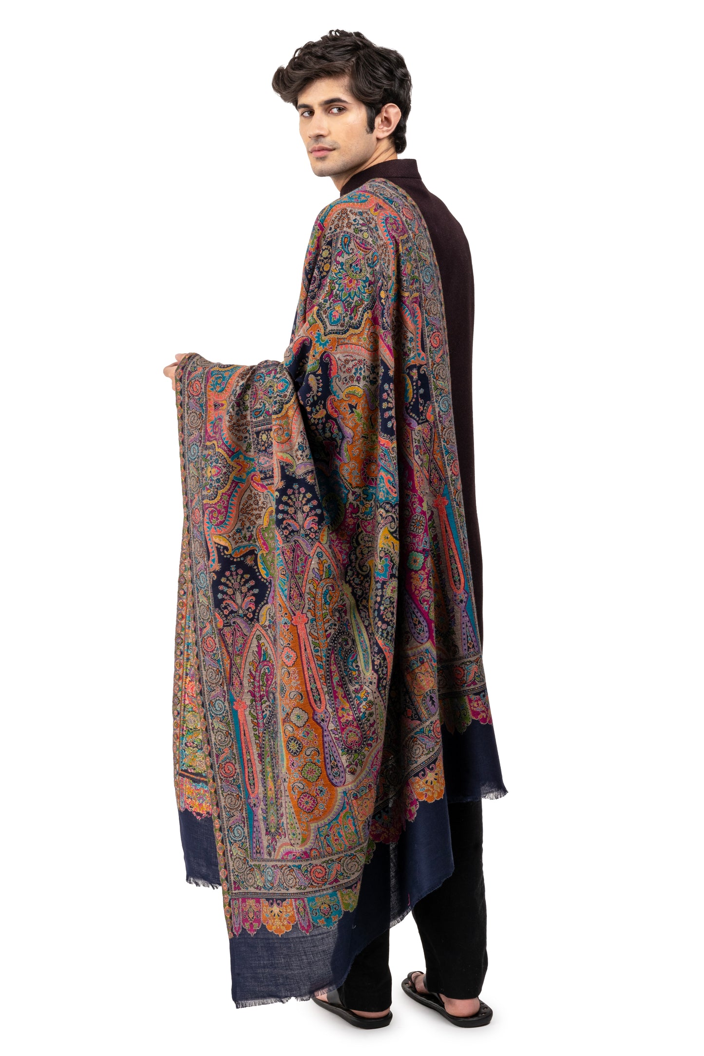 Men Pashmina Blend Kani Shawl with Paisley and Floral Artwork