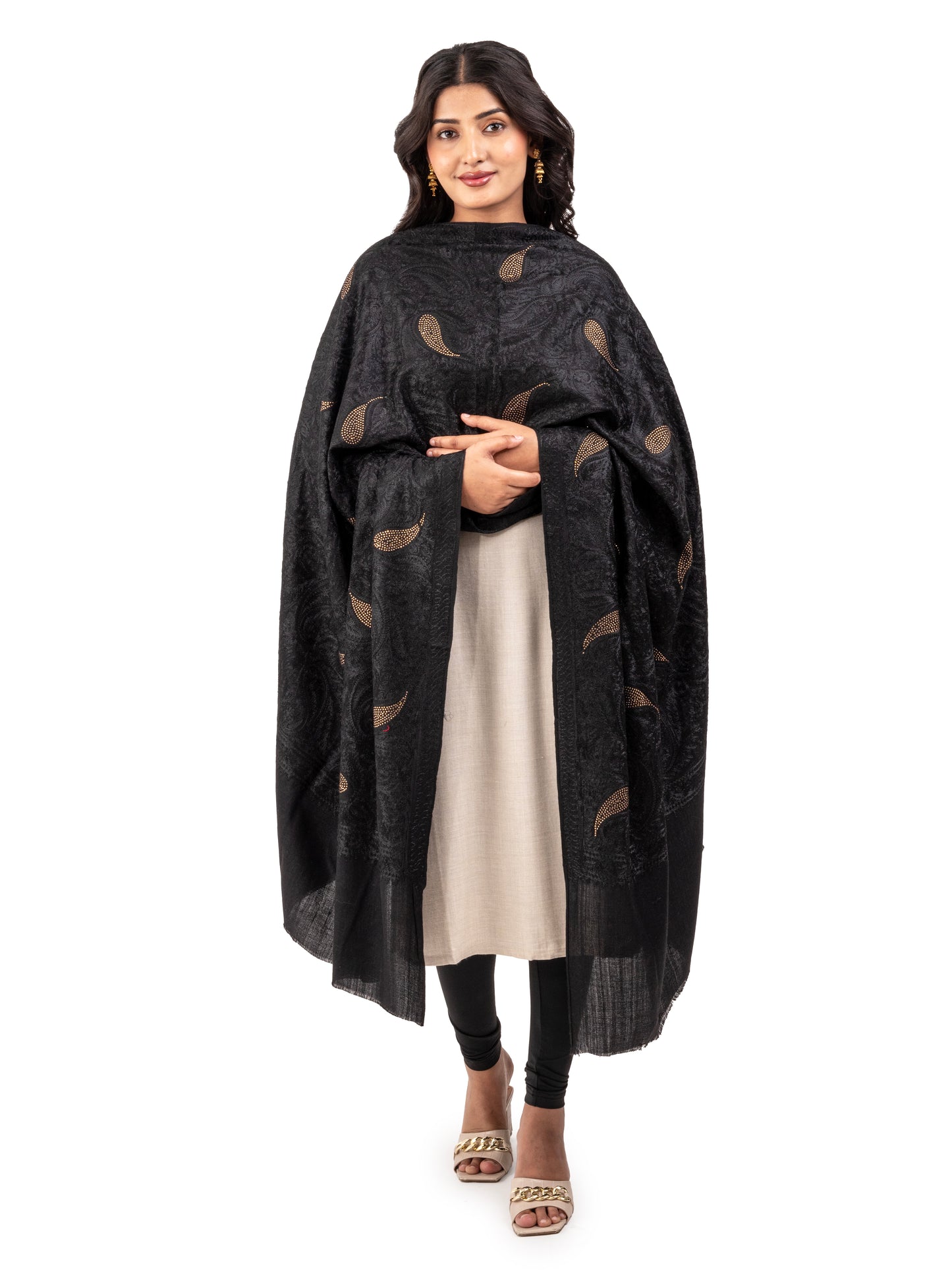 Elegance meets artistry in this Aari embroidery shawl adorned with shimmering crystals. Crafted from luxurious faux pashmina in classic and vibrant colours, this shawl is perfect for weddings, formal events, or even casual outings. Its soft warmth and intricate design make it a stunning accessory and an ideal gift for any occasion.